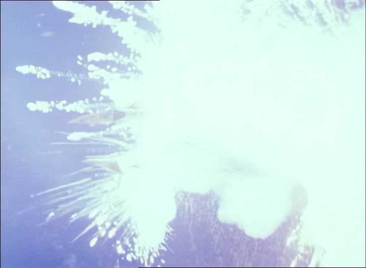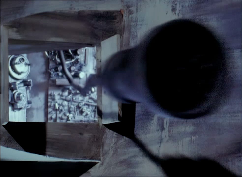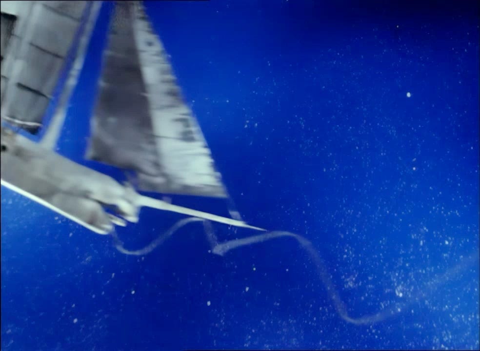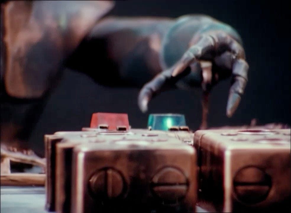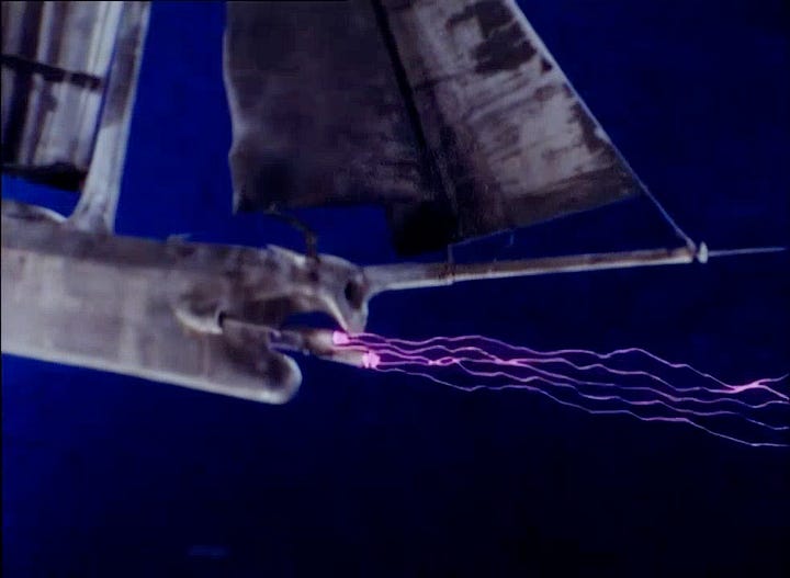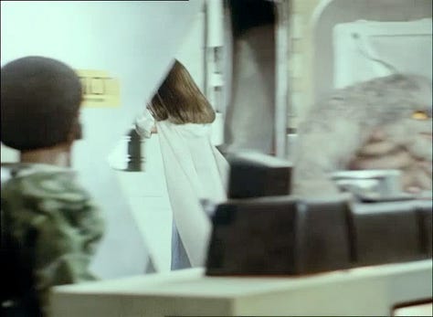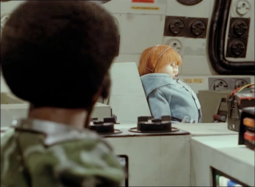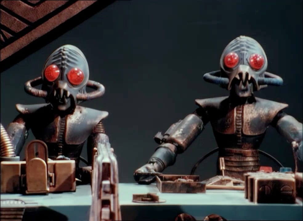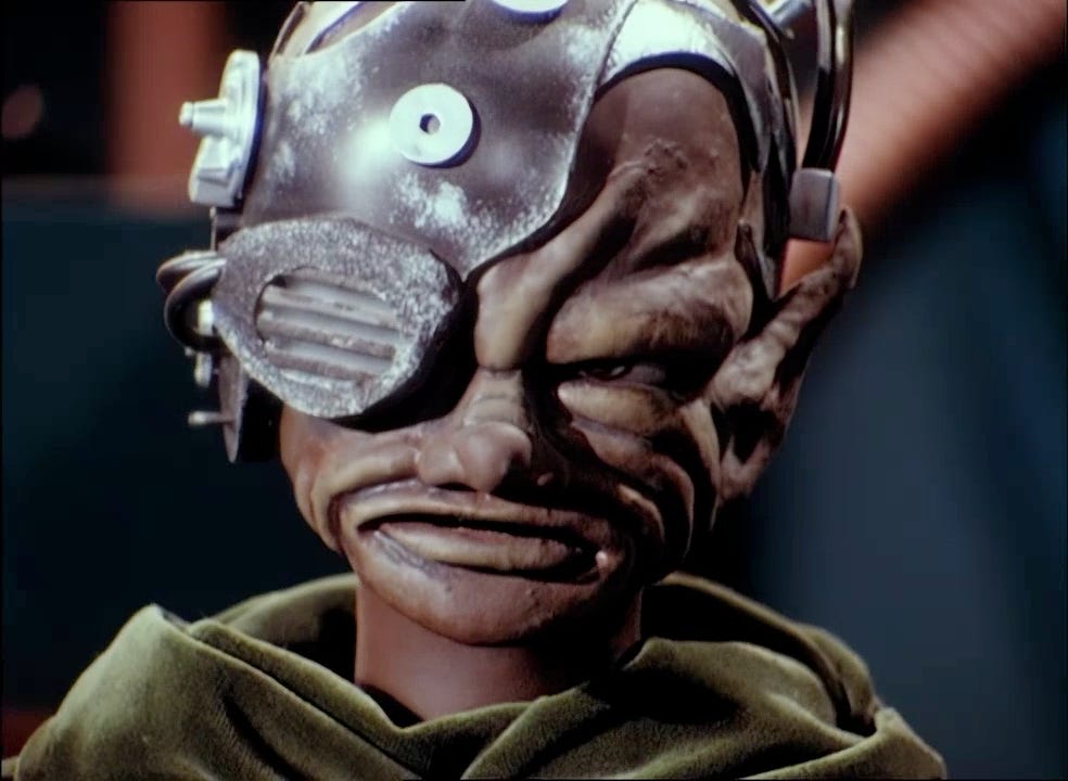His two henchman hide in terror from this unexplained phenomena but the Master is unflinching. Calmly, he greets her as she appears on his bridge as a semi-transparent ghostly apparition.