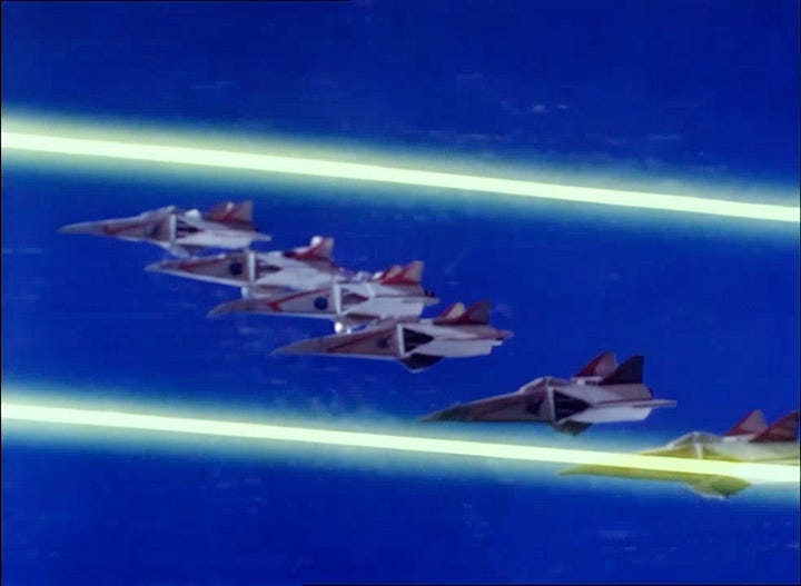 As if to make up for all those earlier unseen space battles, we now get a real honey of an astrofighter launch sequence. It’s pure tokusatsu gloriousness. By this point in the series, the special effects crew had really honed their skills to maximum to create some truly impressive shots.